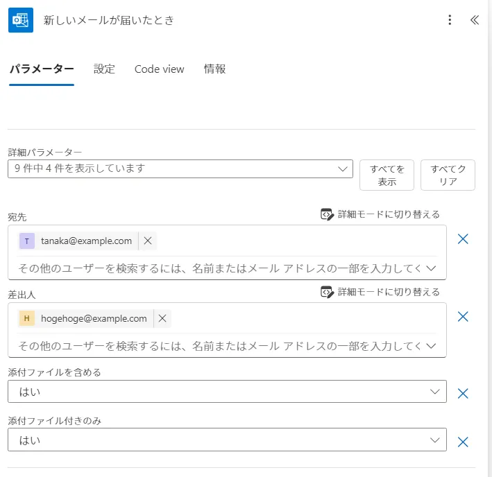 | hogehoge@example.comから、tanaka@example.com宛に添付ファイル付きのメールがきたら、エクセルに行を追加する |