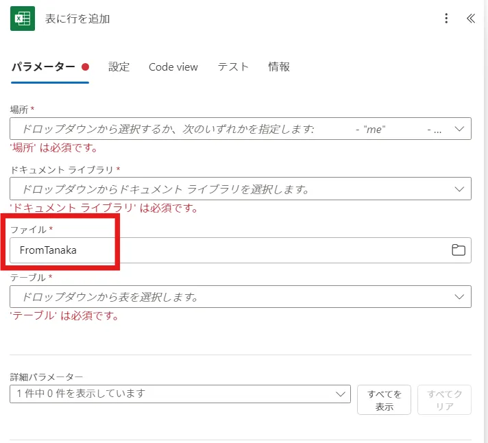 Excelのファイルの指定や、Teamsのチャンネルなど、階層を持ち、段階的に指定が必要な(場所→ドキュメントライブラリ→ファイル→テーブルなど)パラメーターについては、Copilotに頼らず手動で設定した方が早い印象を受けました。