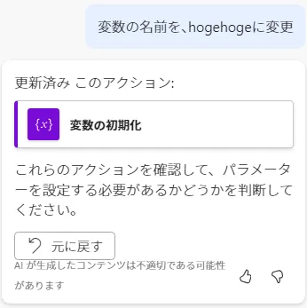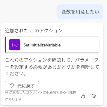 例えば、「変数の初期化」アクションを追加する場合。Copilotなら「変数を用意したい」と指示するだけです。