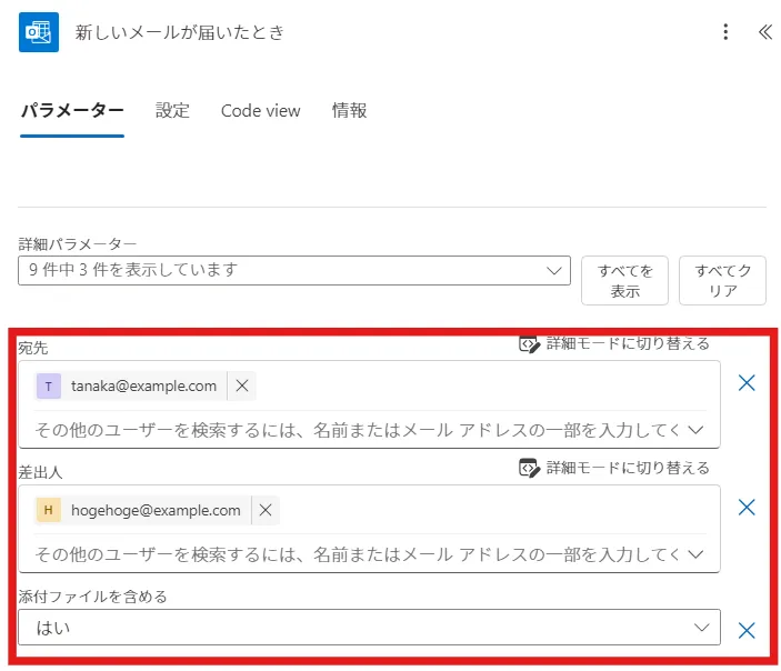 | 「hogehoge@example.comから、tanaka@example.com宛に添付ファイル付きのメールがきたら」に変更して |