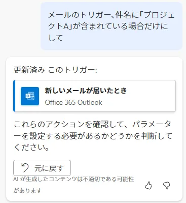 仮に同じ種類のアクションがなかったとしても、単純な設定(メールアドレス等の入力や、「はい」「いいえ」を選択するだけの項目)であれば、Copilotに指示するよりも、手で直してしまった方が早いです。