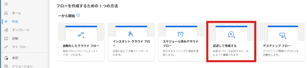 あるいは、「作成」タブ内の「記述して作成する」からも、Copilotによるフローの作成が可能です。