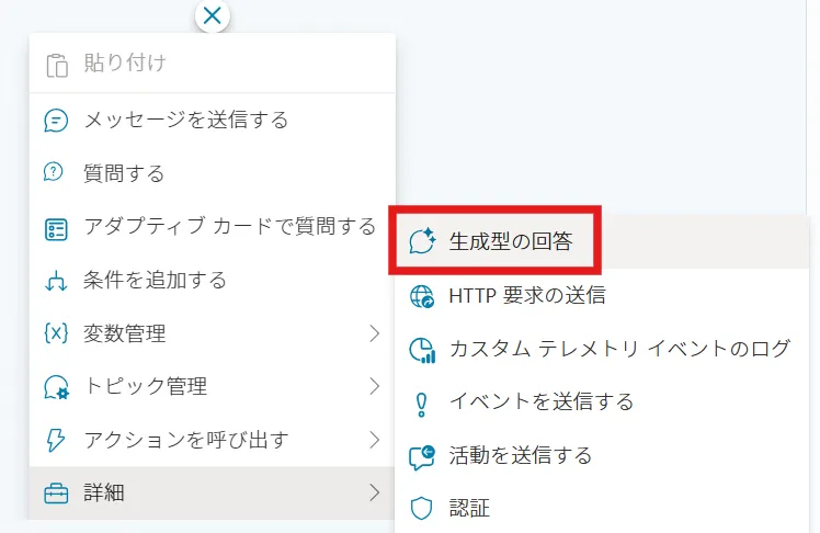 定型文ではなく、生成AIからの回答を返信するには、「生成型の回答」ノードを使用します。