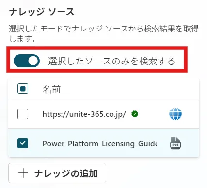 選択したソースのみを検索するをOnにし、参照させたいナレッジをチェックします。