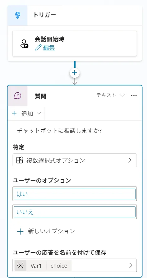 選択肢ごとに処理を分岐させる場合は、「質問」ノードの複数選択式オプションを利用します。