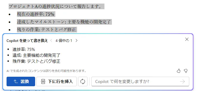 (自動書き換え後、右下のチャット欄に指示をすることで、指示有りの書き換えが行えます)