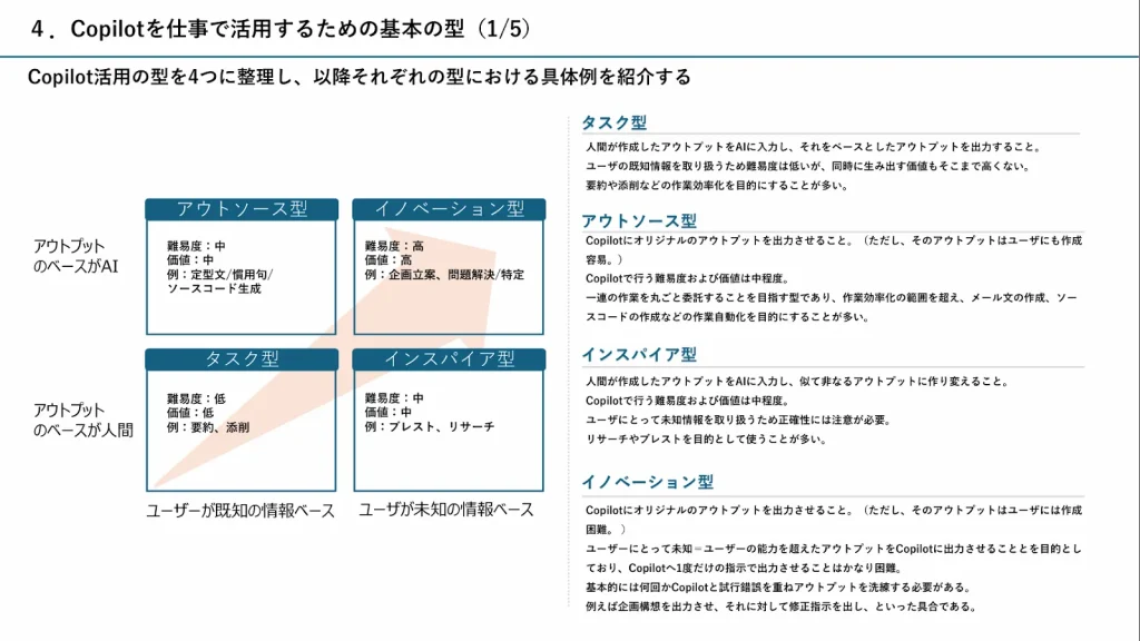 | 【基礎編】Copilot研修用資料 株式会社Unite 提供 目次 ・1. はじめに ・2. Copilotとは? ・3. Copilotでできること ・4. Copilotを仕事で活用するための基本型 ・5. TeamsでのCopilot活用 ・6. OutlookでのCopilot活用 ・7. PowerPointでのCopilot活用 ・8. WordでのCopilot活用 ・9. ExcelでのCopilot活用 ・10. OneNoteでのCopilot活用 ・11. LoopでのCopilot活用 ・12. WhiteboardでのCopilot活用 ・13. Power AutomateでのCopilot活用 ・14. Copilotの注意事項 ・15. Copilotの機能詳細一覧 はじめに 本資料はMicrosoft 365ツールにおいてCopilotを効果的に活用するための具体例をまとめています。Copilot含むその他生成AI等のツールに関して、業務においてうまい活用方法を見いだせていない方向けの内容です。本資料でご紹介する内容は2024年7月時点におけるものであることにご留意ください。 Copilotとは? Copilotとは、Microsoft 365ツール上で動作するLLM(Large Language Model)で、業務効率化を促進するAIツールのことです。LLMは人工知能技術を用いて人間の言語能力を模倣するために設計されたAIモデルであり、膨大な量のテキストデータを学習し、言語の構造とパターンを学習することで、テキストを作成したり、既存のテキストを編集・要約したりする能力に優れています。 Copilotでできること ・Copilotをはじめ生成AIにできることは広範に渡ります。特に以下の点が特徴です。 ・社内文書検索: 「アレ、あのファイルどこ行った?」から解放されます。 ・カレンダー情報検索: 「アレ、あの会議いつやったっけ?」から解放されます。 ・Teamsチャット情報検索: 「アレ、あのチャットどこでやったっけ?」から解放されます。 さらに、各ツール内での操作(グラフ作成、関数記述、文章校正など)も代行させることが可能です。 Copilotを仕事で活用するための基本型 Copilot活用の型を4つに整理し、それぞれの型における具体例を紹介します。 ・タスク型: ユーザーが既知の情報ベース。例:要約、添削。 ・アウトソース型: ユーザが未知の情報ベース。例:企画立案、問題解決。 ・インスパイア型: 人間が作成したアウトプットをAIに入力し、似て非なるアウトプットに作り変える。例:ブレスト、リサーチ。 ・イノベーション型: Copilotにオリジナルのアウトプットを出力させる。例:企画構想。 TeamsでのCopilot活用 TeamsとCopilotの親和性はMS365ツールの中でも非常に高いです。以下のように活用できます。 ・ユーザーとのチャット画面上(チャットCopilot) ・会議のチャット画面上(ミーティングCopilot) ・M365アプリ上(M365チャット) 具体的には、会議の議事録を要約したり、過去のチャットの要点を抽出したり、メールや社内ドキュメントを横断検索することが可能です。 OutlookでのCopilot活用 要約や文案作成はもちろん、面倒な受信ルールの自動作成も可能です。以下のように活用できます。 ・特定のメールスレッド上での要約 ・簡単なプロンプトで返信の下書きを作成 ・メール受信時のルールを自動作成 PowerPointでのCopilot活用 既存ファイルの理解や編集に長けていますが、新規で作成する場合には内容やデザイン上の品質に懸念があります。以下のように活用できます。 ・Wordファイルから PowerPoint ファイルへの変換 ・要約の作成 ・スライドの枚数を圧縮 WordでのCopilot活用 文章の生成、校正、編集に長けています。以下のように活用できます。 ・簡単なアウトラインからドキュメントの下書きを作成 ・Office ファイルからトーク履歴を作成 ・ドキュメントを要約して重要なポイントを抽出 ExcelでのCopilot活用 データ分析に特化していますが、機能が少ないです。以下のように活用できます。 ・データに沿ったグラフを自動で作成 ・既存データに沿った新規のデータを追加、編集、加工 OneNoteでのCopilot活用 過去のメモを検索、メモに基づいたブレスト、整理などに応用が広がります。以下のように活用できます。 ・ノートを要約して重要なポイントを抽出 ・ノートにもとづいてToDoリストを作成 LoopでのCopilot活用 OneNote同様のメモ検索、整理やWordのように文章生成機能に長けています。以下のように活用できます。 ・ページを要約して重要なポイントを抽出 ・コンポーネントの内容にもとづいて表を作成 WhiteboardでのCopilot活用 文章の生成ではなく、アイデアの整理、ブレスト、要約などに特化しています。以下のように活用できます。 ・複数のアイデアを分類して整理 ・コンテンツを Loop コンポーネントに変換して共有 Power AutomateでのCopilot活用 アイデアを自動化フローに落とし込む機能は他に類のない機能です。以下のように活用できます。 ・業務自動化の手順を質問 ・既存フローの内容に関する質問 Copilotの注意事項 Copilotを始めとした生成AIに限らず、最新テクノロジーとリスクは隣り合わせのため、しっかり注意事項を確認しましょう。以下の点に注意が必要です。 ・セキュリティ: Microsoft社の厳重なセキュリティによって情報漏洩等のリスクから守られていますが、「Microsoft社自体に情報が渡ってしまう」ことに変わりは