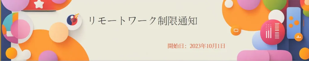 | リモートワーク制限に関する通知 リモートワーク制限について 社員各位、 2024年12月1日より、リモートワークを週2回までに制限させていただきます。以下の理由に基づき、今回の制限を実施することを決定いたしました。 社内資源の活用促進 弊社には、高速なネット環境や最新の複合機など、業務を効率化するための優れた設備が整っています。これらの社内資源を最大限に活用するため、オフィスでの勤務を奨励いたします。 業務の効率化 リモートワークでは、1~2分の短い相談や確認にもアポイントが必要となることが多く、業務の効率が低下する傾向があります。オフィスでの勤務により、迅速なコミュニケーションが可能となり、業務全体の効率化が期待されます。 ご理解とご協力のほど、よろしくお願いいたします。 総務 |