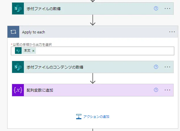 他のApply to eachであっても、手順は同じです。SharePointの添付ファイル取得を例に解説します。