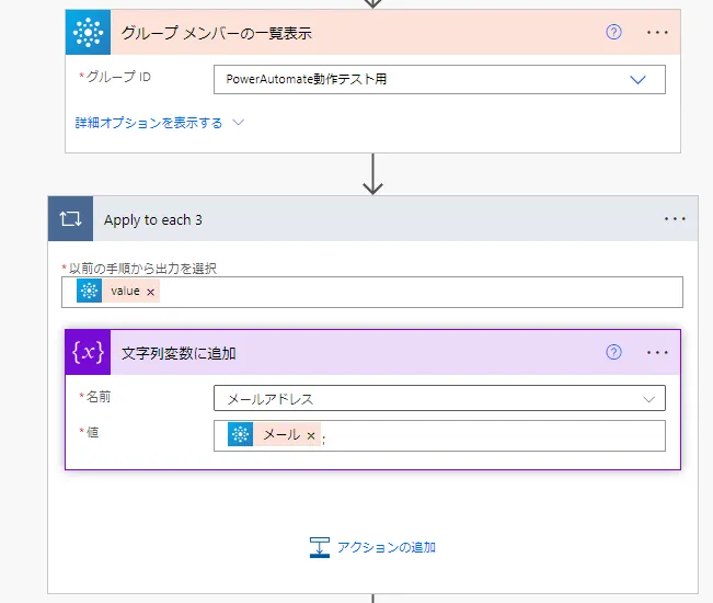 Apply to each でメンバーの人数分だけ、処理(メールアドレスを配列に格納するなど)を繰り返し実行できます。