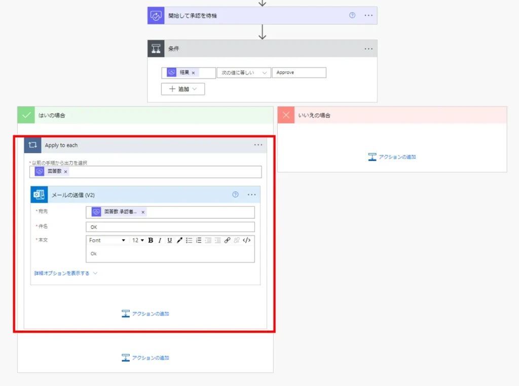 動的なコンテンツの「回答数 承認者の電子メール」当てにメールを送る場合、承認者の数分繰り返すように、「回答数」に対してApply to eachが行われます。