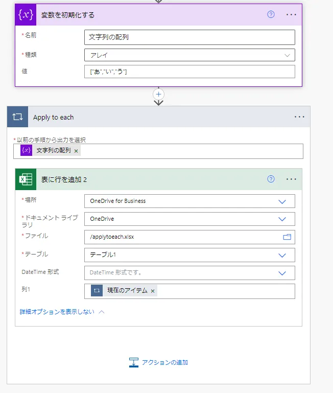 以下、複数の値が入った「文字列の配列」の値の数だけ、Excelへの行追加を繰り返すフローです。