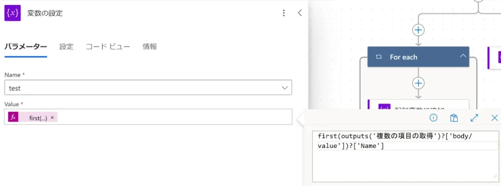 2で作成した式「first(outputs(‘複数の項目の取得’)?[‘body/value’])」の後ろに、3の式をつけると最初の項目を取得する式ができあがります。