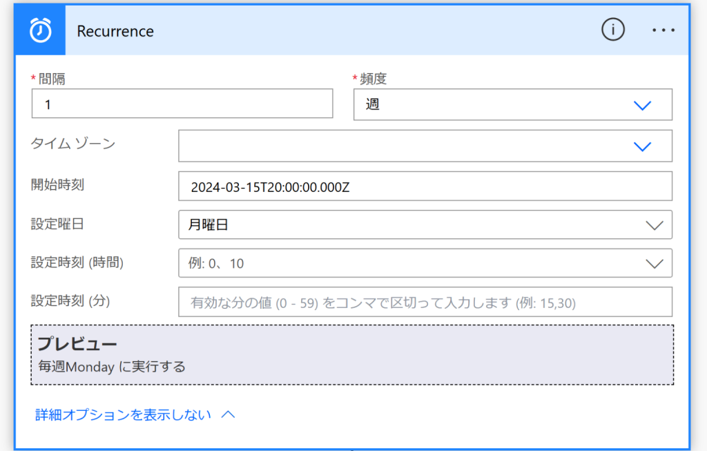 詳細オプションにて、「何曜日の何時から」など、より細かい設定ができます。