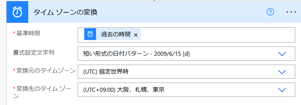 「タイムゾーンの変換」アクションで、日本時間に変換します。