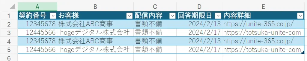 | 【1件目】 (1)契約番号:12345678 (2)お客様:株式会社ABC商事 (3)配信内容:書類不備 (4)回答期限日:2024/02/13 (5)内容詳細:https://unite-365.co.jp/ 上記内容についてご確認下さい |