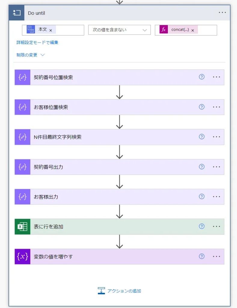 | 繰り返し条件 | 本文(テキスト変換後)が、「N件目」の文字列を含まない 状態になるまで、繰り返す |