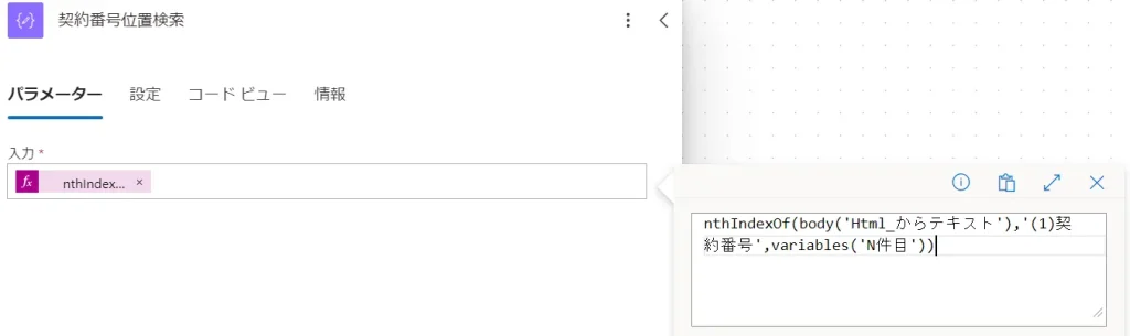 | nthIndexOf(body(‘Html_からテキスト’),'(1)契約番号’,variables(‘N件目’)) |