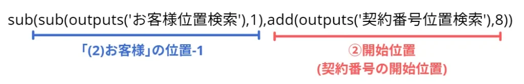 | sub(sub(outputs(‘お客様位置検索’),1),add(outputs(‘契約番号位置検索’),8)) |