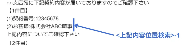 繰り返し1回目に先頭の「(1)契約番号」の開始位置が、2回目には上から2番目の「(1)契約番号」の開始位置が取得されます。