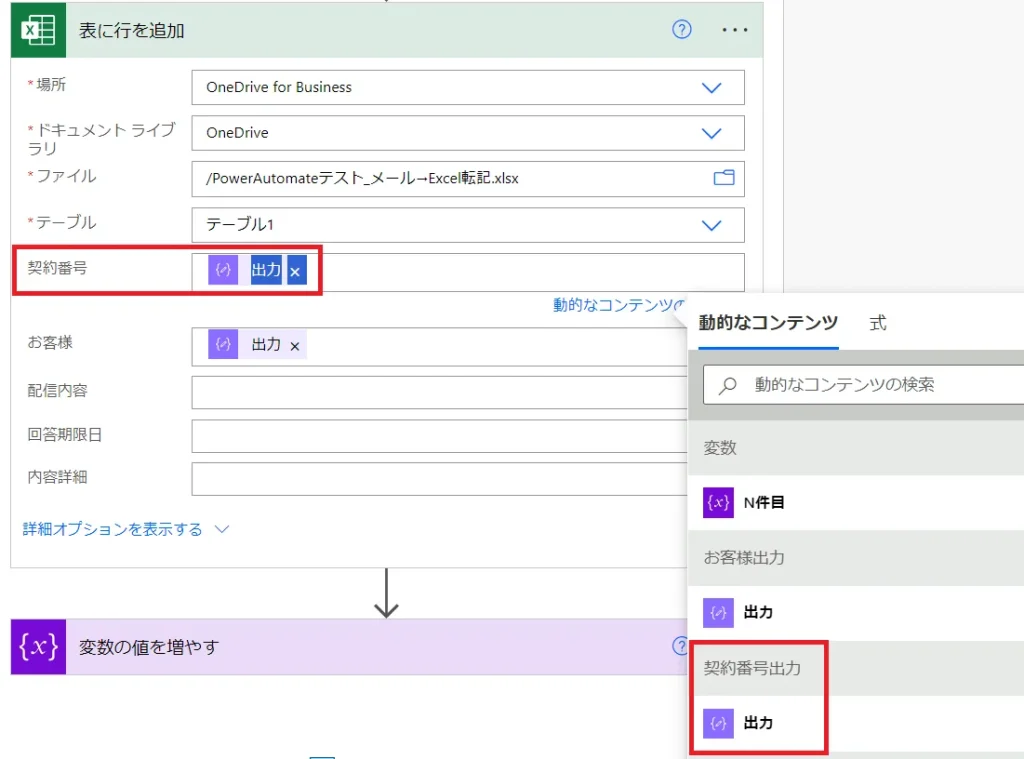 Excelの<表に行を追加>アクションから、転記先のExcelを指定し、各列に、対応する出力アクションの結果を記述します。