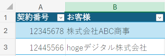 事例そのままでは項目数が多いので、契約番号とお客様の2つだけのケースで解説します。