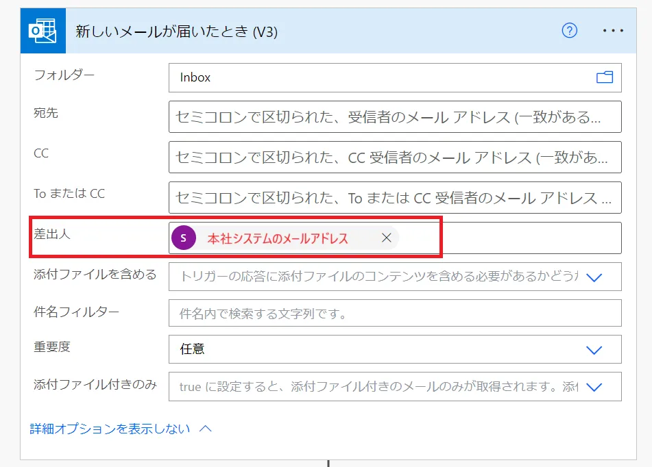 トリガーは、本社のシステムメールからメールが届いた場合です。