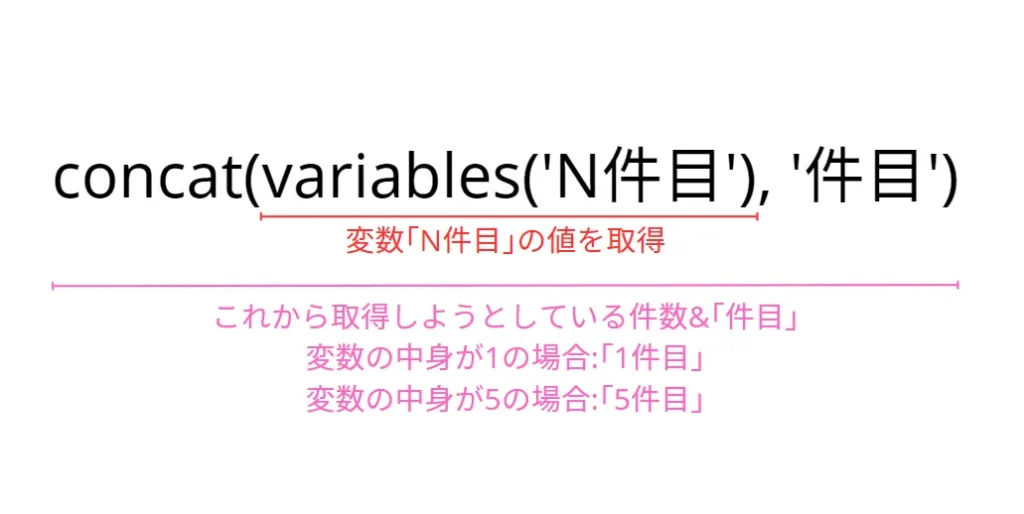 | concat(variables(‘N件目’), ‘件目’) | 変数N件目の値と文字列「件目」を結合 |