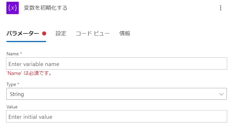 <変数の初期化>アクションを使い、以下の変数を用意します。