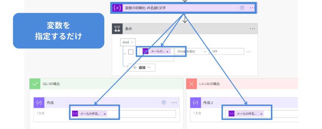 例えば「受信したメールの件名の先頭5文字を、2箇所以上のアクションで使う」ような場合。